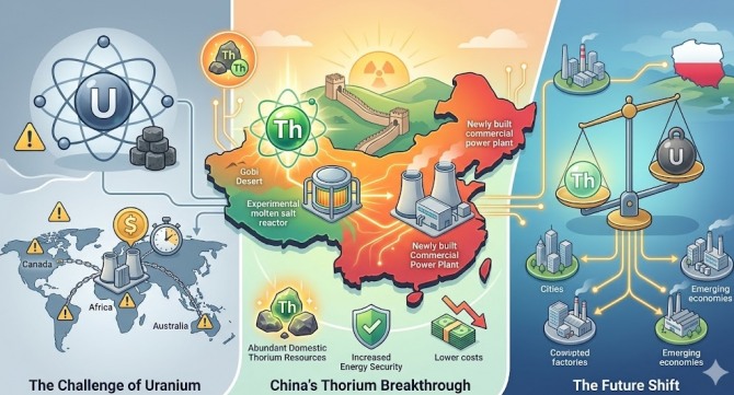 이미지 확대보기폴란드의 대표적인 에너지 전문 매체인 글로브너지아(GLOBEnergia)는 6일(현지시각) 보도와 원자력 업계에 따르면, 중국과학원 상하이 응용물리연구소는 최근 간쑤성 우웨이 실험용 원자로(TMSR-LF1)에서 토륨을 핵분열이 가능한 우라늄-233으로 전환해 실제 가동하는 데 성공했다. 이는 단순한 기술 진보를 넘어 건설 단가를 서방 국가의 4분의 1 수준으로 낮춘 중국의 ‘원전 굴기’가 상업화 단계에 진입했음을 의미한다.