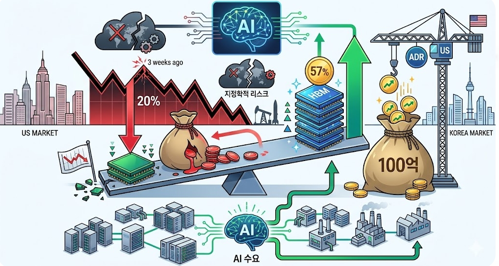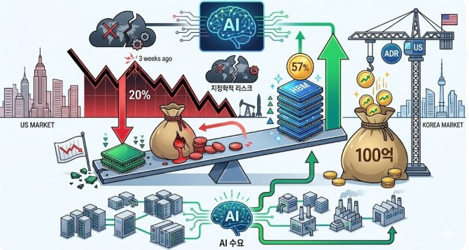 이러한 급락의 배경에는 단순한 차익실현을 넘어선 ‘수급적 공포’가 자리 잡고 있다. △인공지능(AI) 기대감 선반영 이후 밸류에이션 부담 △중동 리스크에 따른 위험자산 회피 △SK하이닉스 미국주식예탁증서(ADR) 상장에 따른 자금 재배치 우려가 복합적으로 작용한 결과로 풀이된다. 엔비디아의 최대 고대역폭메모리(HBM) 공급처인 SK하이닉스는 올해 안으로 뉴욕 증시에 100억 달러(약 15조 원) 규모의 ADR 상장을 예고했다. 이는 외국 기업의 뉴욕 데뷔 중 역대 최대 수준이다.