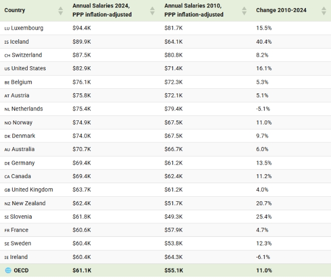아이슬란드는 약 8만9900달러(약 1억3485만 원)로 높은 임금 수준과 함께 40.4%의 상승률을 기록해 예외적인 사례로 꼽혔다.