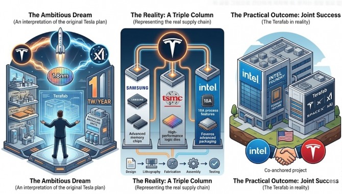 인텔이 테라팹에서 수행하는 핵심 역할은 자사의 18A(1.8나노미터급) 공정 기술과 첨단 패키징 기술(EMIB·포베로스)의 적용이다. 텍사스 오스틴 현지 시설을 인텔 파운드리 모델에 맞게 구축하고, 이를 기반으로 대규모 양산 체계를 빠르게 갖추는 방식이다. 같은 날 일렉트렉(Electrek)은 "실질적으로는 인텔 파운드리의 오스틴 확장이며, 머스크 계열사들이 핵심 고객(앵커 커스터머)으로 참여하는 구조"라고 분석했다.