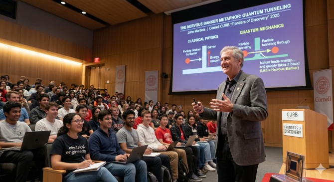 10일(현지시각) 코넬 대학교 학내 매체인 더 코넬 데일리 선(The Cornell Daily Sun)에 따르면 그는 양자 터널링 현상을 설명하며 “양자 역학은 마치 매우 불안해하는 은행가와 같다”고 정의했다. 고전 물리학에서는 에너지가 부족하면 장벽을 넘을 수 없지만, 양자 세계에서는 자연이 입자에게 아주 짧은 순간 에너지를 빌려주어 장벽을 통과하게 만든다는 것이다. 마티니스 교수는 “자연은 입자가 터널을 파듯 장벽을 통과하도록 에너지를 빌려주지만, 불안한 은행가처럼 이를 매우 빠르게 회수하려고 한다”고 덧붙였다.
