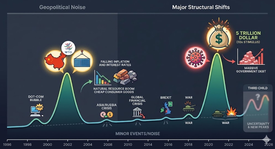 시장은 늘 시끄럽다. 전쟁과 정권 교체 같은 지정학적 리스크는 매일 신문 1면을 장식하며 투자자를 유혹하지만, 역사적으로 이는 단기적 소음에 그치는 경우가 많았다. 전문가들은 장기적인 수익률의 궤적을 바꾸는 것은 눈에 보이는 사건이 아닌 '돈의 구조적 이동'이라고 입을 모은다. 다가올 '세 번째 변곡점'을 대비해 투자자가 반드시 점검해야 할 3가지 체크포인트를 짚어본다.