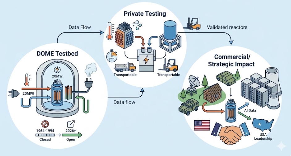 이번 시설 개소와 동시에 글로벌 원전 공룡들의 실전 테스트가 시작된다. 래디언트(Radiant Energy)는 올봄부터 고온 가스 냉각 방식의 마이크로 원자로 ‘카레이도스(Kaleidos)’를 DOME에 입고해 1년간 실제 가동 데이터를 확보한다.