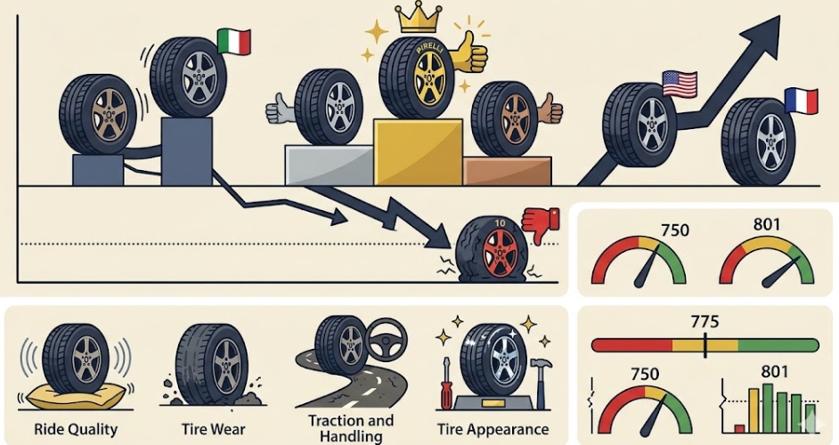 이번 조사에서는 브랜드별 희비가 극명하게 갈렸다. 이탈리아의 **피렐리(Pirelli)**801점을 기록, 조사 대상 중 유일하게 800점대를 돌파하며 1위에 올랐다. 이어 BF굿리치(790), 미쉐린(788) 등 전통적인 강자들이 상위권을 수성했다.