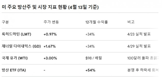 전쟁 초기 불확실성에 동반 하락했던 방산주들은 실적 시즌을 앞두고 일제히 고개를 들었다. 록히드마틴(LMT)이 1% 상승한 것을 비롯해 제너럴 다이내믹스(GD)는 1.7%, 노스롭 그루먼(NOC)과 L3해리스(LHX)는 각각 1.1%와 1.2% 올랐다.