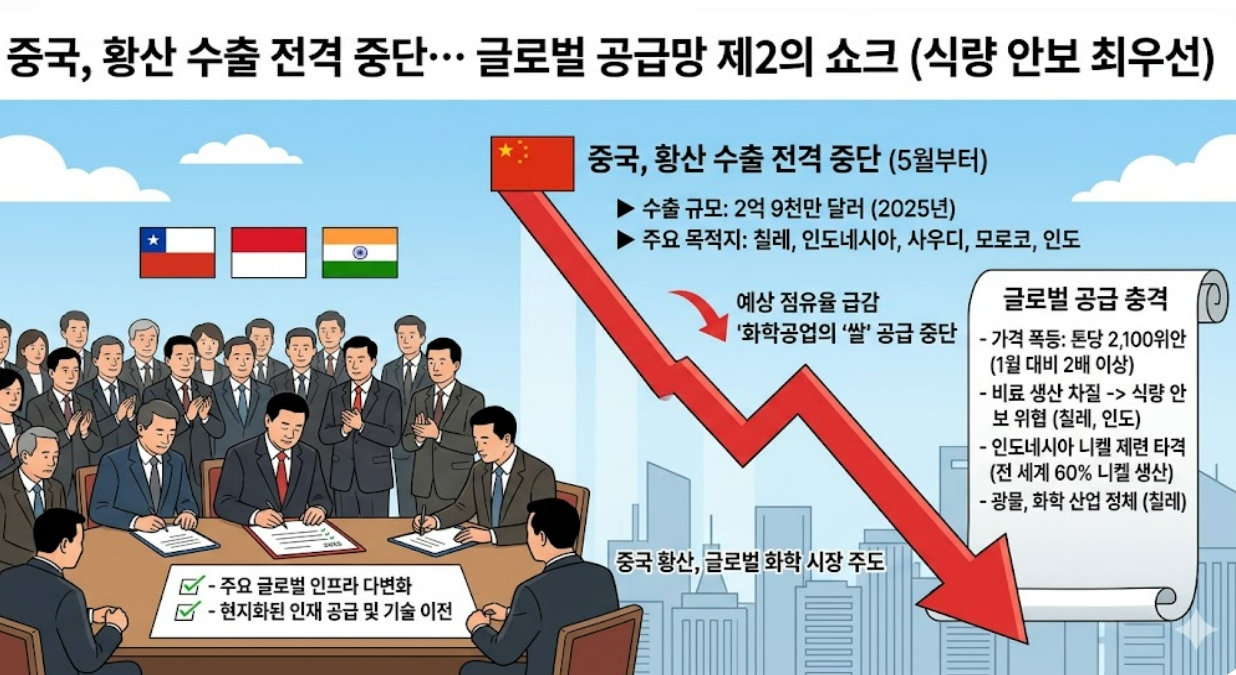 중국은 2025년 기준 세계 최대 황산 수출국으로, 칠레, 인도네시아, 사우디아라비아, 인도 등에 막대한 물량을 공급해왔다. 베이징은 황산 수출로 벌어들이는 달러보다 ‘내수 비료 공급 안정’을 더 큰 가치로 판단한 셈이다.