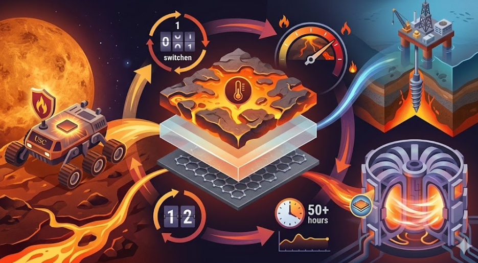 이미지 확대보기미국 남가주대학교(USC) 연구팀은 지난 13일(현지시각) 국제 학술지 '사이언스(Science)'를 통해 화씨 1300도(섭씨 약 700도)의 극한 환경에서도 안정적으로 구동하는 차세대 메모리 칩 프로토타입을 공개했다. 파이낸셜타임스(FT)와 기즈모도 등 외신에 따르면, 이 칩은 별도의 냉각 장치 없이도 50시간 이상 데이터 처리 성능을 유지하며 상업적 활용 가능성을 입증했다.