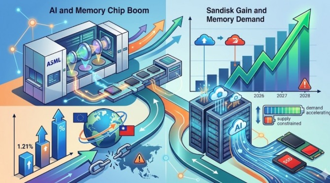 장비 단에서 ASML이 길목을 지키고 있다면, 메모리 단에서는 샌디스크(SNDK)의 약진이 독보적이다. 샌디스크는 올해 주가가 약 300% 폭등하며 오는 20일 나스닥 100 지수 편입을 앞두고 있다.