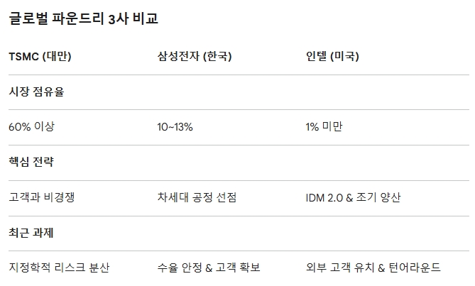 인텔이 18A(1.8nm) 공정에서 주요 팹리스 고객을 선점하는 속도만큼, 삼성전자는 테일러 공장 가동과 3nm GAA 수율 안정화로 기술 실체를 증명해야 한다. 애플·엔비디아·퀄컴 등 글로벌 대형 고객사들이 지정학 리스크 관리 차원에서 인텔을 '제3의 공급처'로 공식화하는 흐름이 가속되면, TSMC 1강 구도에 균열이 생기고 한국 반도체 기업들의 점유율 방어 전선은 더욱 좁아진다.