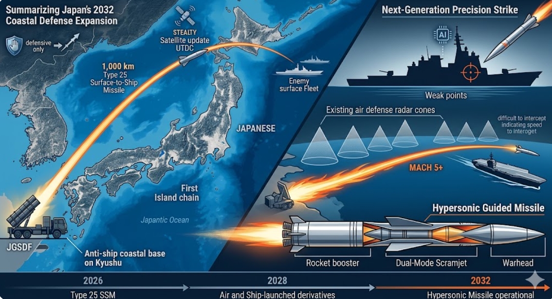 타입 25 미사일의 등장은 일본의 '스탠드오프 디펜스(원거리 타격)' 전략을 상징한다. 과거 타입 12 미사일은 사거리가 200km에 불과해 적 함정이 영해 근처까지 접근해야 대응이 가능했다. 하지만 사거리 1000km인 타입 25는 적이 일본 영토에 접근하기 훨씬 전, 안전한 거리에서 타격할 수 있는 '창' 역할을 한다.