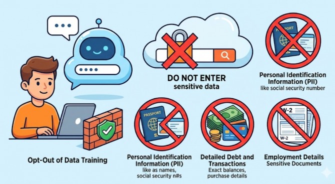 금융 정보 보호의 핵심은 '익명성 유지'다. AI에게 구체적인 수치를 입력하는 대신, 숫자를 반올림하거나 일반화해 질문해야 한다. AI는 401(k) 기여 한도나 Roth IRA의 장단점과 같은 보편적 정보를 확인하는 용도로 제한적으로 사용한다.