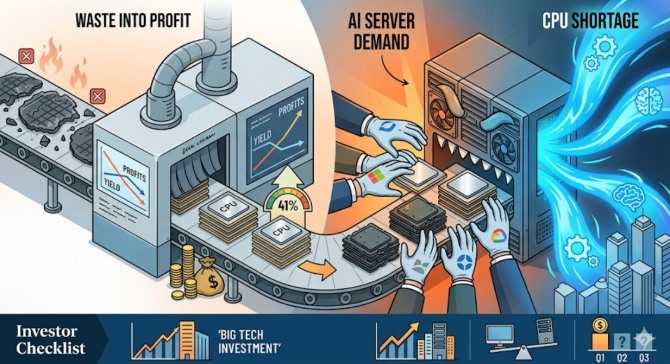 반도체 제조 과정에서 웨이퍼 가장자리는 품질이 낮고 결함이 많아 통상 폐기 대상이다. 하지만 최근 공급망 대란 속에서 이 'B급 제품'들이 정상 제품과 함께 날개 돋친 듯 팔려나가고 있다. 테크 분석가 벤 바자린(Ben Bajarin)은 인텔 IR팀을 인용해 "고객사들이 고성능 CPU를 확보하기 위해 성능 기준이 낮은 칩이라도 구매하고 있다"고 전했다. 기업들이 성능 등급을 낮춰서라도 물량을 확보하려는 현상이 나타나면서, 인텔은 버려야 할 재고를 수익으로 전환하는 ‘수율의 역설’을 만들어냈다.
