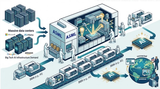 ASML은 현재 인공지능(AI) 칩을 대량 생산하는 초미세 공정 장비를 독점 공급하는 유일한 기업이다. 챗GPT나 제미나이 같은 최첨단 AI 모델은 ASML 장비 없이는 구현 불가능하다. 크리스토프 푸케(Christophe Fouquet) ASML 최고경영자(CEO)는 최근 매출 가이던스를 상향하며 "고객사의 생산 병목 현상을 해결하기 위해 가용한 모든 도구를 동원 중"이라고 밝혔다.