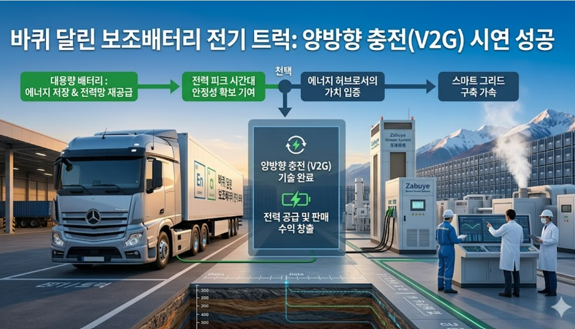 이번 시연의 핵심은 대용량 배터리를 탑재한 전기 트럭이 전력이 남는 시간대에 에너지를 저장했다가, 수요가 급증하는 피크 시간대에 다시 전력망으로 에너지를 공급하는 과정이다.