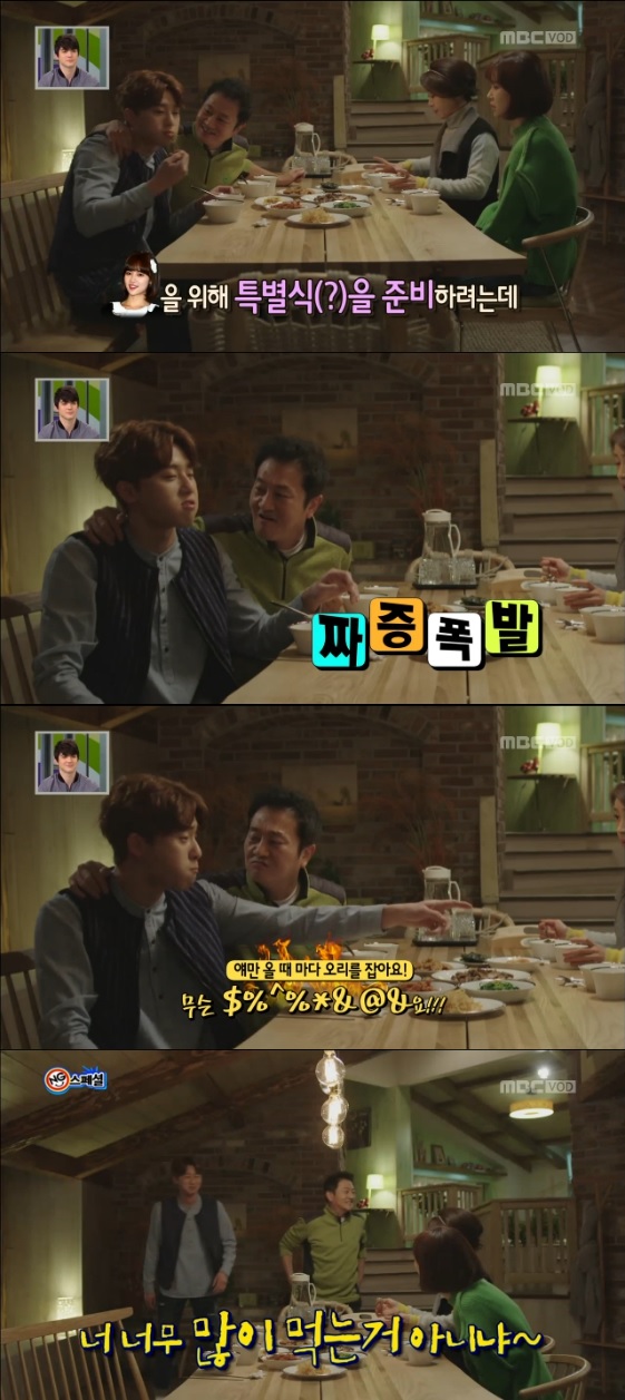배우들은 웃음을 꾹 눌러 참아 이대로 OK 사인을 받는 듯 했지만 아버지 대오 역할의 박준규는 "넌 왜 말을 못하냐"며 "너 너무 많이 먹는 것 아니냐"고 말해 모두의 웃음을 폭발해 NG가 났다.