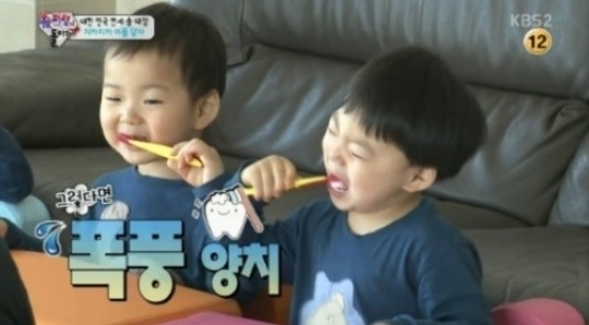 송일국은 삼둥이에 "칫솔을 빨지 말라"며 "사랑이 누나는 양치 잘하는 남자를 좋아한다"고 말하자 만세가 분노의 양치질을 선보여 웃음을 자아냈다.