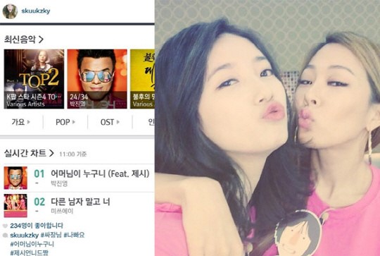 이미지 확대보기13일 오전 수지는 자신의 인스타그램을에 박진영이 미쓰에이의 음원 차트를 앞지른 캡처를 게재했다.