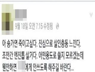송가연(수박E&M.21)은 지난 해 10월 Y씨로부터 "아 송가연 죽이고 싶다. 진심으로 살인충동 느낀다. 조만간 엔진톱 살 거다. 어떤 용도로 쓸지 모르겠는데 웬만하면 네X에게 안 쓰도록 해주길 바란다"의 협박을 받은 바 있다.