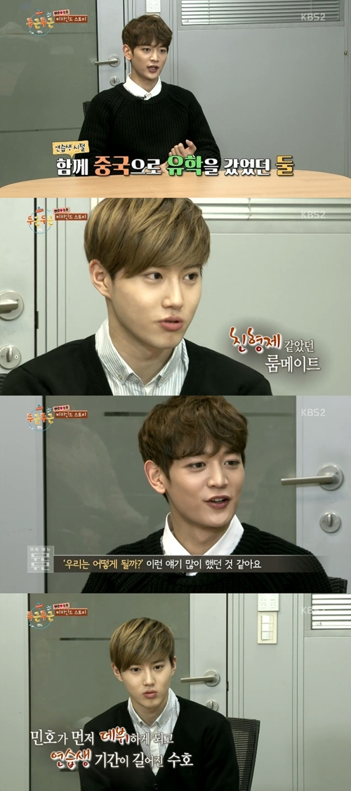 민호는 “연습생 시절 수호와 함께 중국으로 유학을 갔었다”며 과거를 회상했고 수호는 “친형제같이 지냈다”고 말했다.