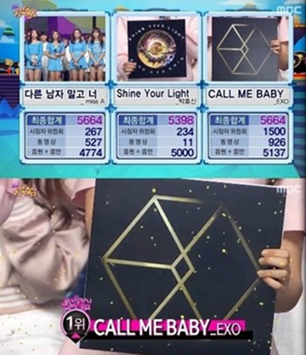 이미지 확대보기엑소는 18일 오후 방송한 MBC '쇼! 음악중심'에서 (Call me baby)'로 미쓰에이 '다른 남자 말고 너', 박효신의 '샤인 유어 라이트(Shine your light)'를 제치고 정상에 올랐다.