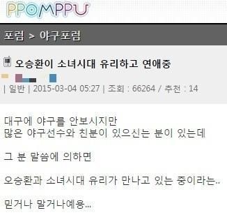 해당 커뮤니티 게시판에는 '오승환이 소녀시대 유리하고 연애중'이라는 제목의 글이 올라왔다. 글쓴이는 "대구에 야구를 안보시지만 많은 야구선수와 친분이 있으신 분이 있는데 그 분 말씀에 의하면 오승환과 소녀시대 유리가 만나고 있는 중이라는 믿거나 말거나예요"라고 적었다.