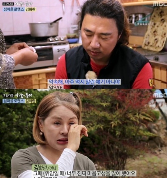김화란은 "서울에 있던 시절 남편은 위암을 진단 받았다. 스트레스와 음주 때문이었다"며 "신랑한테 많이 의지를 했다. 위암 선고를 받은 후 갑자기 무서워지더라"며 눈물을 흘려 보는 이들의 마음을 안타깝게 했다.