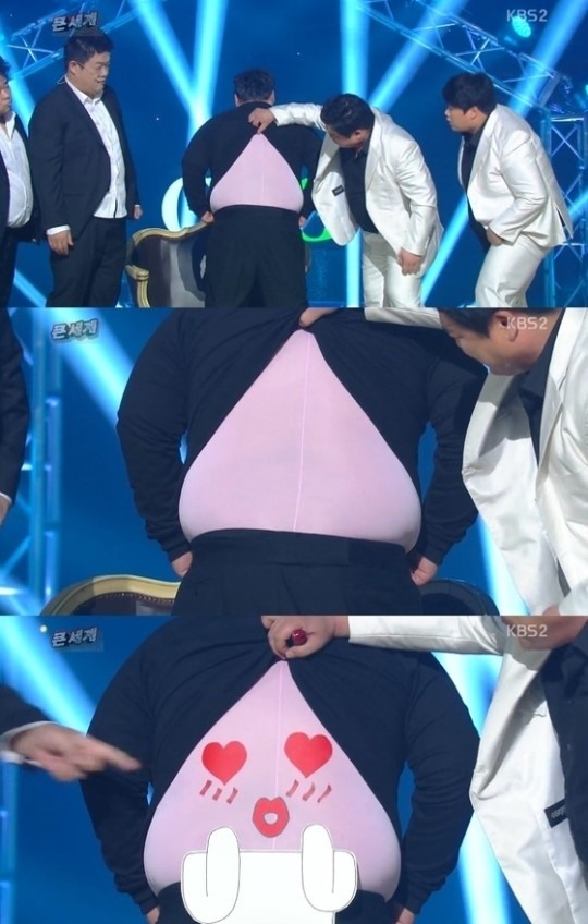 김준현은 자신을 밀치고 돌아서는 김수영에게 "어딜가냐"며 그의 옷을 벗겼다. 이에 분홍색 내복을 입은 김수영의 등이 드러났고, 김준현은 "이거 휴대폰에서 많이 본 것 같은데"라며 곰곰이 생각하는 모습을 보였다.