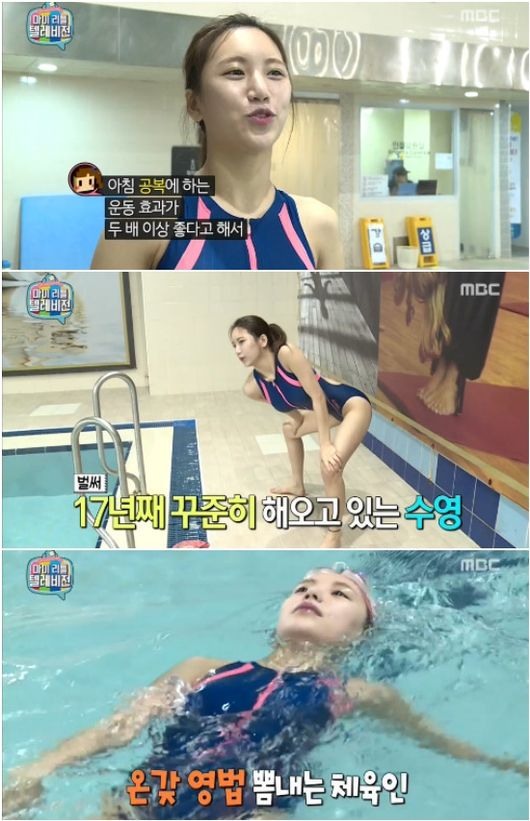 예정화는 17년째 꾸준히 수영을 하고 있다며 평영부터 시작해 온갖 영법으로 수영을 선보여 시선을 사로잡았다.