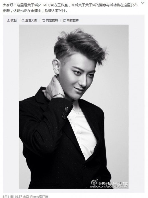 "안녕하세요! 여기는 황쯔타오(Z.TAO) 공식 공작실입니다. 오늘 이후 황쯔타오의 소식과 일상은 이곳에 업데이트됩니다. 인증 작업이 진행 중이니, 여러분의 팔로잉을 환영합니다."