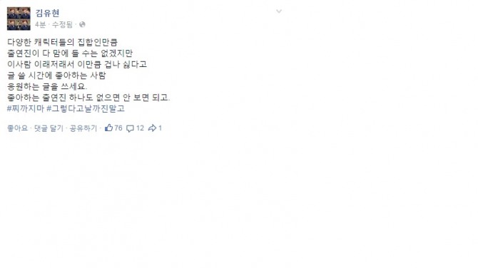 김유현은 최근 자신의 SNS에 "다양한 캐릭터들의 집합인 만큼 출연진이 다 마음에 들 수는 없겠지만 이 사람 이래 저래서 이만큼 겁나 싫다고 글 쓸 시간에 좋아하는 사람 응원하는 글을 써라"며 네티즌들에게 일침을 가했다.