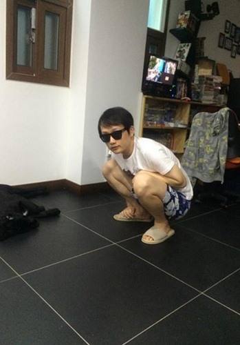 사진 속, 조석은 선글라스를 끼고 쭈그려 앉아 독특한 패션 감각과 포즈를 취하고 있다