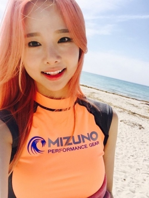 사진 속 솔지는 해변을 배경으로 환한 미소를 짓고 있다.