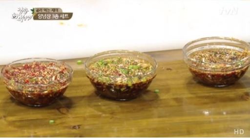 이어 설탕 소주컵 반컵과 깨소금 반 컵을 넣은 후 진간장 종이컵 한 컵 반, 간 마늘 한 숟갈, 참기름을 뿌렸다. 이후 백종원은 완성된 기본 양념장을 세 그릇에 나눈 후, 각각 고춧가루, 마늘종을 넣은 양념장 3종 세트를 완성했다.