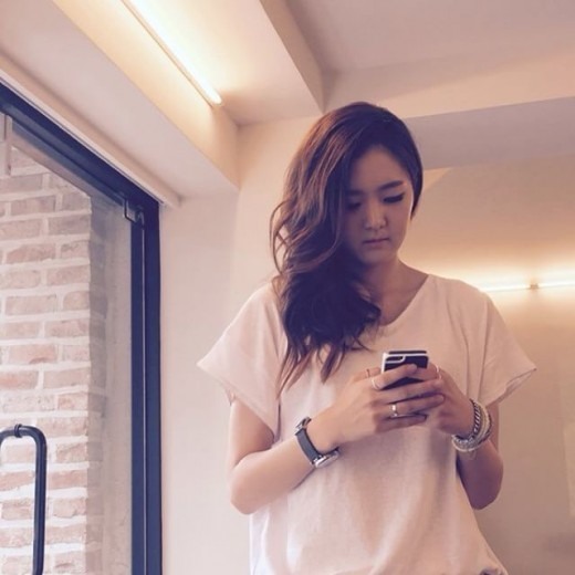 공개된 사진 속 주민정은 스마트폰을 바라보며 포즈를 취하고 있다.