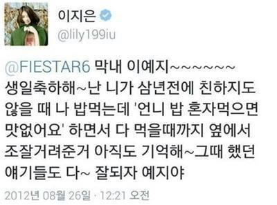 과거 2012년 8월 아이유는 자신의 트위터를 통해서 "막내 이예지 생일 축하해. 난 네가 삼년 전에 친하지도 않을 때 나 밥 먹는데 '언니 밥 혼자 먹으면 맛없어요' 하면서 다 먹을 때까지 옆에서 조잘 거려준 거 아직도 기억해. 그때 했던 얘기들도 다. 잘 되자. 예지야"라는 글을 게재하며 친분을 인증했다.