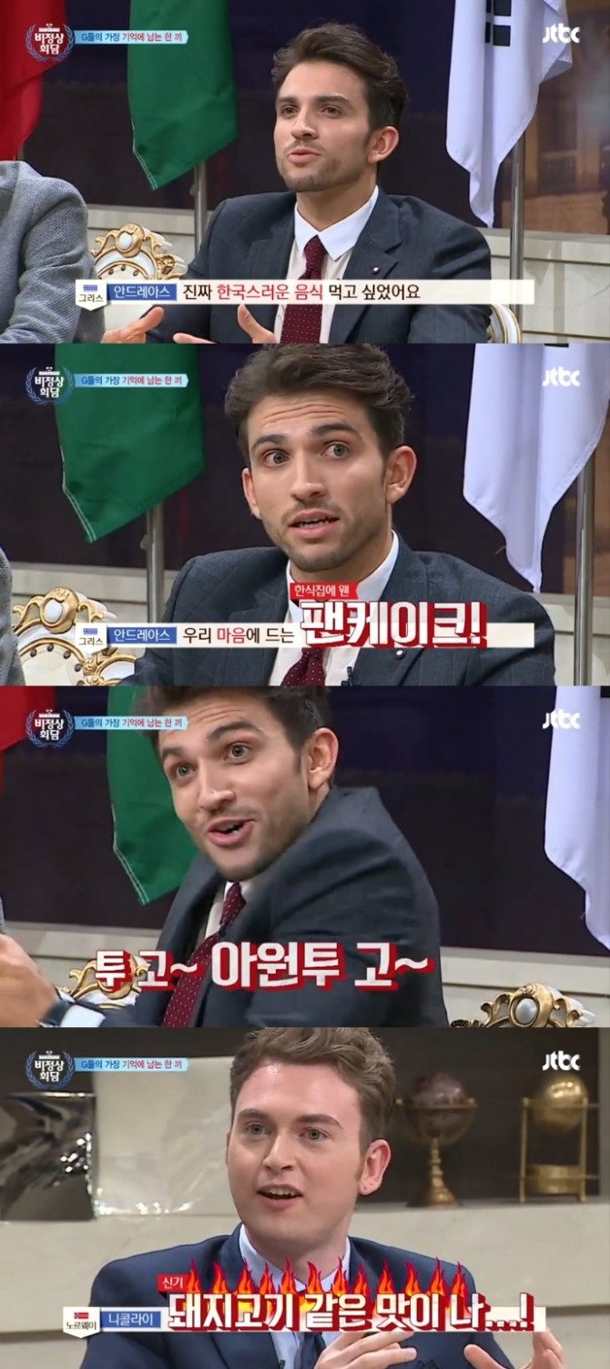 노르웨이 대표 니콜라이도 비슷한 경험을 털어놨다. 니콜라이는 "일본 친구랑 한국 식당에 갔는데 한국말을 잘 못했었다. 사전으로 찾으면서 메뉴판을 봤는데 갈매기살이 있었다"면서 "갈매기살이라니 너무 신났다. 근데 치킨 맛이 날 거라고 생각했는데 돼지고기 맛이 나더라"라고 털어놔 큰 웃음을 자아냈다.