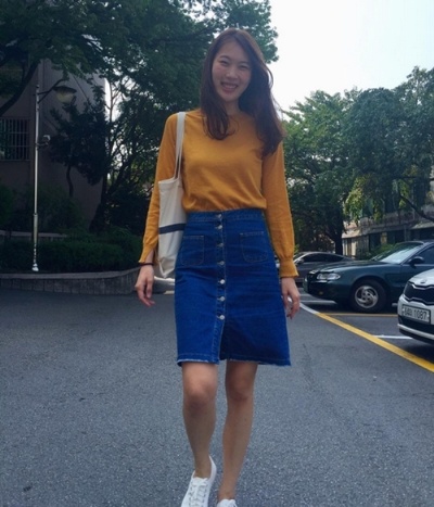 공개된 사진 속 천단비는 겨자색 티셔츠와 앞 트임 청치마를 입고 환하게 웃고 있는 모습으로 카메라를 응시하고 있다.