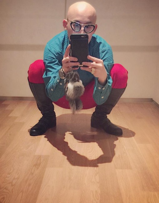 황재근은 사진 속, 청록색 셔츠와 레드 바지에 롱부츠를 매치해 이색적인 패션 감각을 선보였다.
