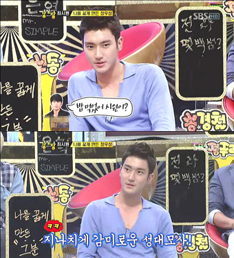 이에 MC이승기가 "너무 연습한것이 티 난다"고 지적했지만 최시원은 굴하지 않고 다시 지나치게 감미로운 목소리의 정우성 성대모사를 해 모두를 폭소케 했다.