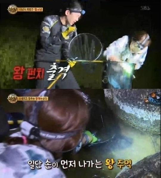 강균성은 뜰채를 넣는 족족 물고기를 잡는 데 성공했지만 펄떡거리는 물고기를 잡지 못했다. 이에 왕지혜는 맨주먹으로 물고기를 기절시켰다.