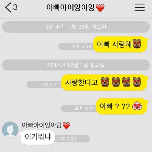 이에 헤이즈는 다음 날 다시 "사랑한다고. 아빠?"라고 보냈다. 이에 아버지는 "이기 뭐냐"고 답해 폭소를 유발했다.