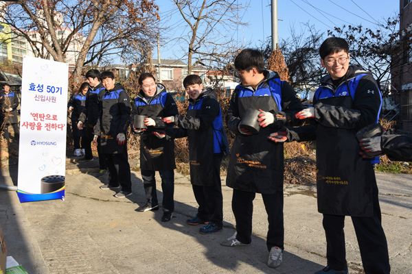 이날 신입사원들과 함께 직접 연탄 나르기에 동참한 조현상 효성나눔봉사단장(부사장)은 “50기 신입사원들과 함께 의미 있는 활동에 동참하게 되어 기쁘다”며 “‘사랑의 연탄나눔’을 통해 이웃과 함께하는 책임감과 효성인으로서의 소속감을 느끼는 시간이 되었길 바란다”고 말했다.