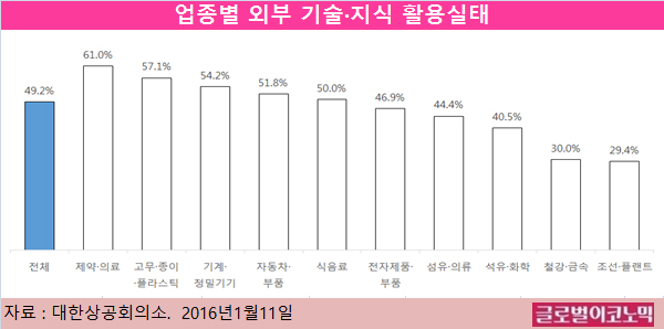 하지만 외부 기술과 지식을 활용하고 있는 기업은 전체의 절반 수준인 49.2%이었다. ‘활용하지 않는다’는 50.8%에 달한다.