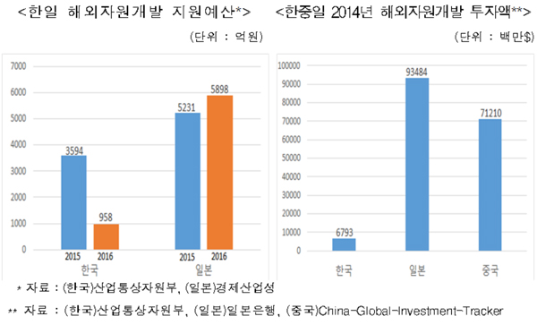 우리 정부의 2016년 해외자원개발 예산은 958억원으로 2015년 3594억원에 비해 약 73% 삭감된 수준이다. 이에 비해 일본은 2016년 우리보다 6배 이상 많은 632억5000만엔(약 5898억원)을 책정했다.