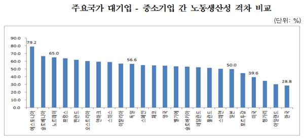 우리나라 대기업과 중소기업 간 노동 생산성 격차는 28.8로 에스토니아 79.2(1위), 노르웨이 65.0(3위), 독일56.6(10위), 일본50.0(19위) 등에 이어 24개 조사대상국 중 최하위를 기록했다.