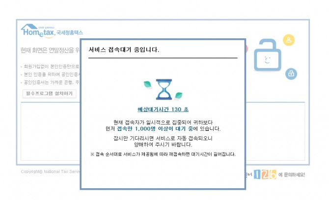 이미지 확대보기국세청은 지난해 접속 대란으로 인한 이용자 불편을 최소화 하기 위해 아래와 같이 현재 접속 상태와 내가 기다려야 하는 시간 등을 실시간으로 보여주도록 했다.