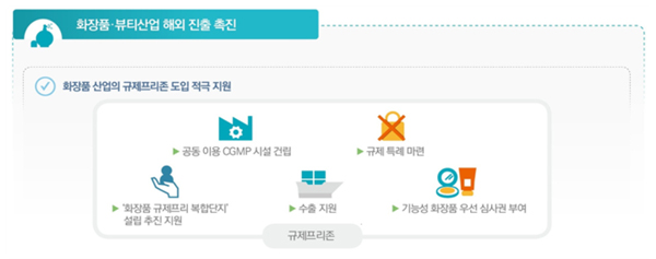 규제프리존에 들어서는 화장품 업체가 기능성 화장품을 제조할 때 우선 심사권을 부여하고 공동으로 우수제조공정시설(CGMP)을 건립하면 적극적으로 지원하기로 했다.