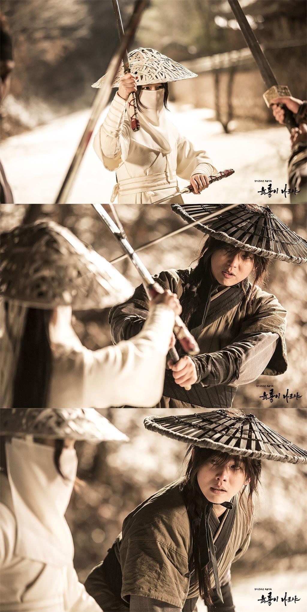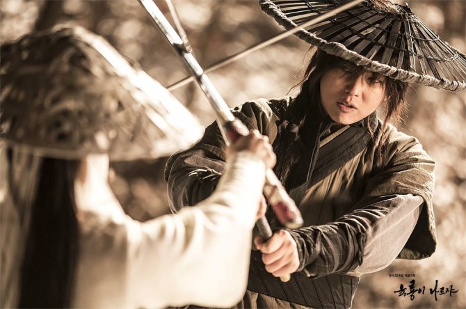 이미지 확대보기26일 방송된 SBS 특별드라마 '육룡이 나르샤' 34회에서 척사광(한예리 분)과 무휼(윤 균상 분)은 두 번째 만남을 갖고 그 자리에서 칼싸움을 벌였다.