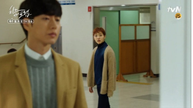 복도에서 유정을 스쳐지나간 홍설은 뒤에서 유정을 지켜보며 '다가가고 싶은 데 다가가지지가 않아'라고 독백한다.