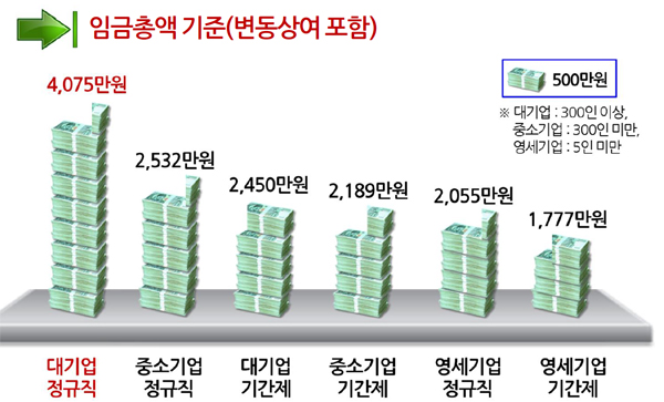 또한 중소기업 정규직은 2532만원, 대기업 기간제 2450만원, 중소기업 기간제 2189만원, 영세기업 정규직 2055만원, 영세기업 기간제 1777만원으로 나타났다.